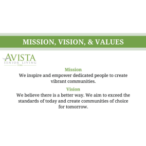 Elevate your professional presence with our custom mission statement cards tailored exclusively for Avista Senior Living staff. Crafted with premium cardstock and customizable designs, these cards are the perfect representation of your role and expertise within our community. Make a lasting impression with every exchange, showcasing your commitment to excellence and dedication to serving our residents with pride.